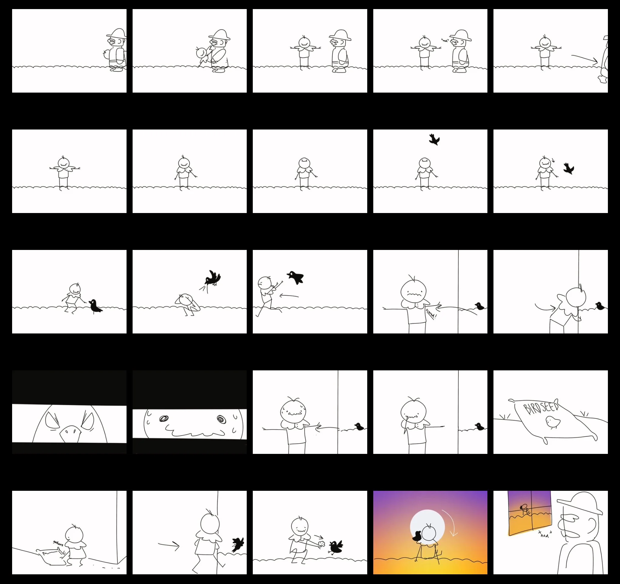 The storyboard for “Patch and the Crow” is how the film was created scene by scene. Overall, the storyboard is faithful to the final adaptation of the short film. Working on the story visually in the beginning made it easier to create the shots for the film.